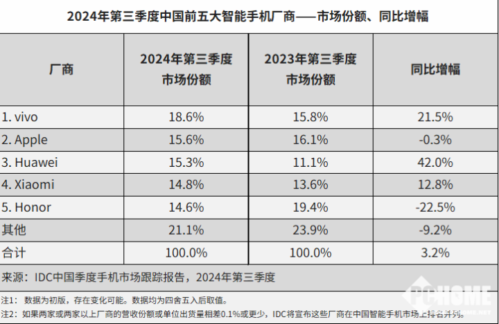 由于这些产品极具竞争力,华为手机的销量节节攀升。IDC数据显示,2024年第三季度,华为手机出货量增长42%,占据15.3%的份额,排名第三。